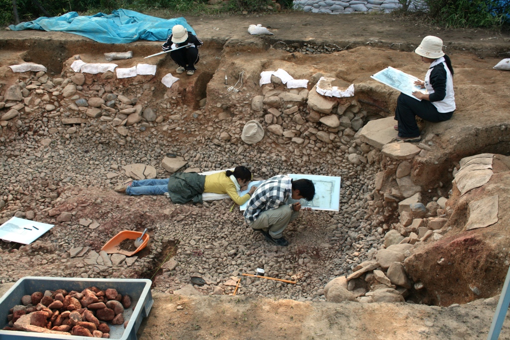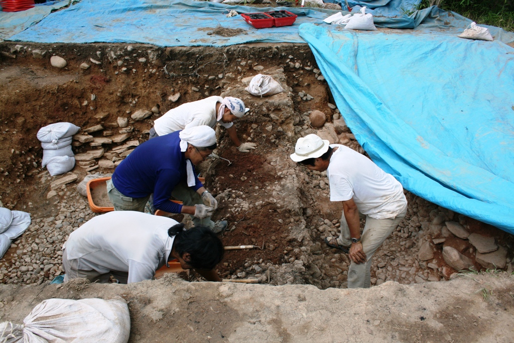 げている様子がはっきりした。2006年度にも、墓坑の掘り込み口よりも外側まで粘土がおよぶことを確認していた。精良な粘土であり、墓坑縁部のみとは考えられないので、やはり、墓坑全体を被覆粘土風に粘土で封じていたと推測できる。