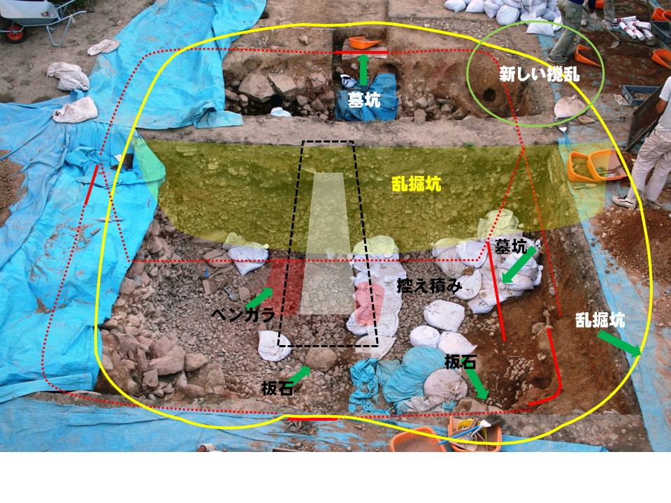 ・東西での掘り込みの違いは、以前に断面模式図を示した通り。盗掘坑は東は墓坑上口よりも広い。この東西の差から、石棺は(石棺があったかどうかも未確定ですが)東側に蓋を開けたのだろう、あるいは転がしたのだろうと思われる。