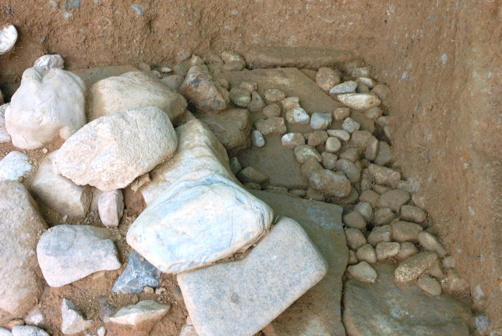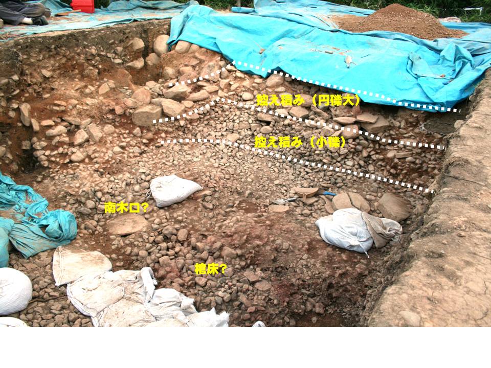 ・なお、遺骸に副葬品を添え、棺蓋を被せる儀礼時に、それがまったく平らな空間であったとは考えにく、ある程度の深さのある空間を作り出していたとみるべきではないか。そうなると上部の大礫は擁壁としてのものであったことも考えておかなければならない。