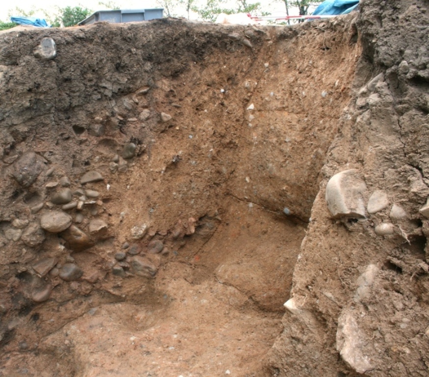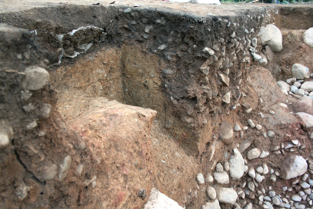 ・西壁は、控え積みの純礫層が立ち上がる。下半分は小礫を入れ、上部には大きな円礫を用いている様子が明瞭である(写真下の右)。