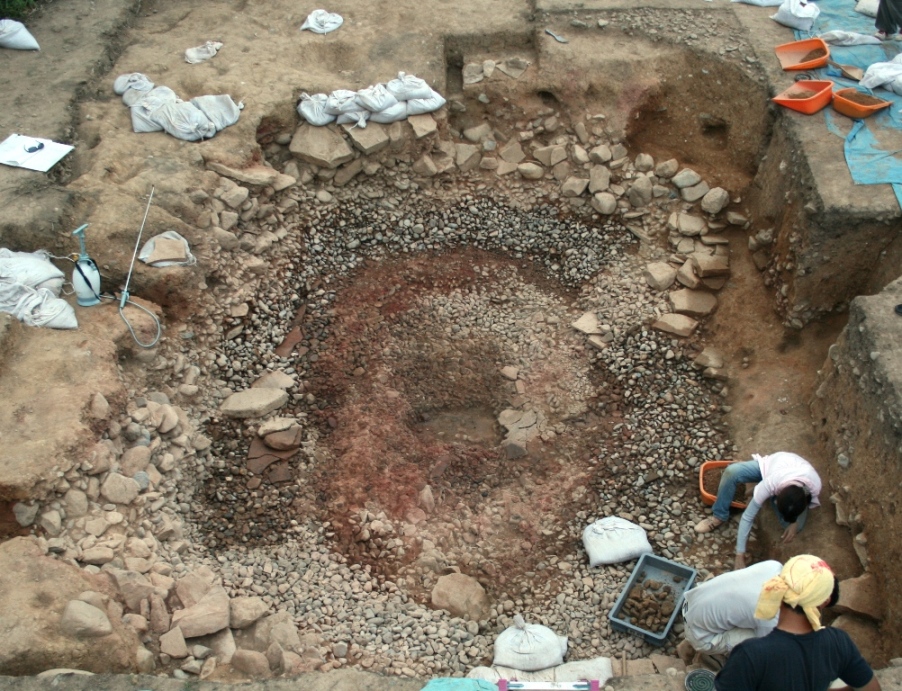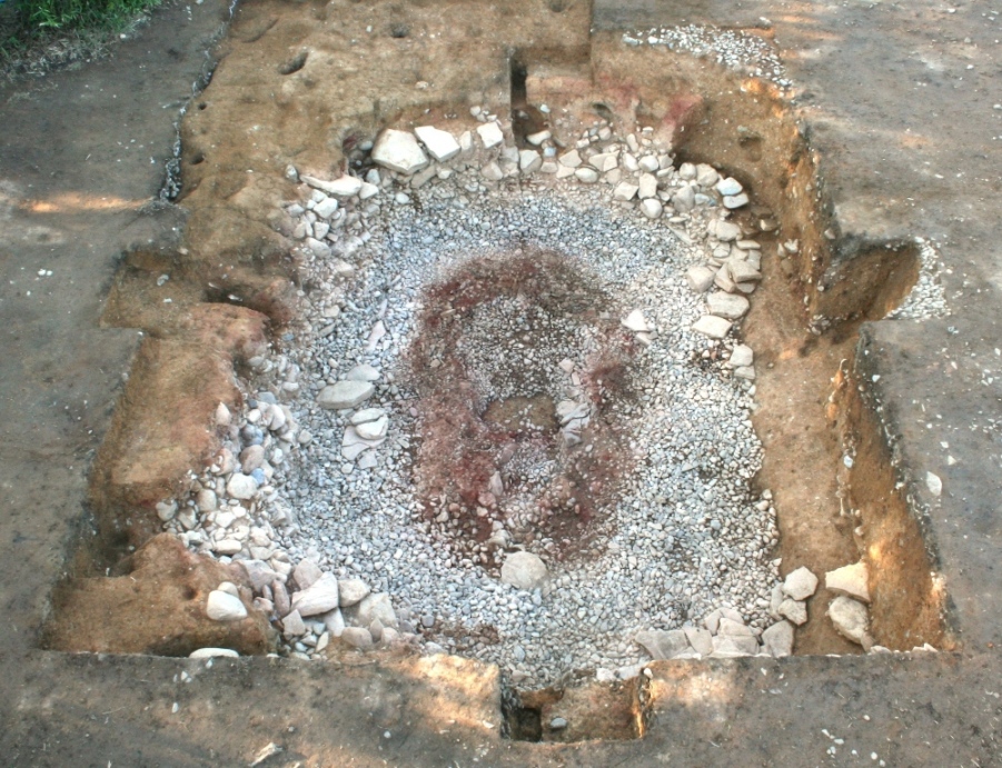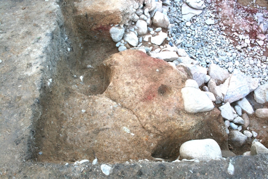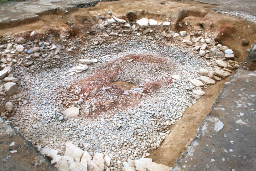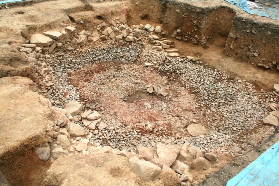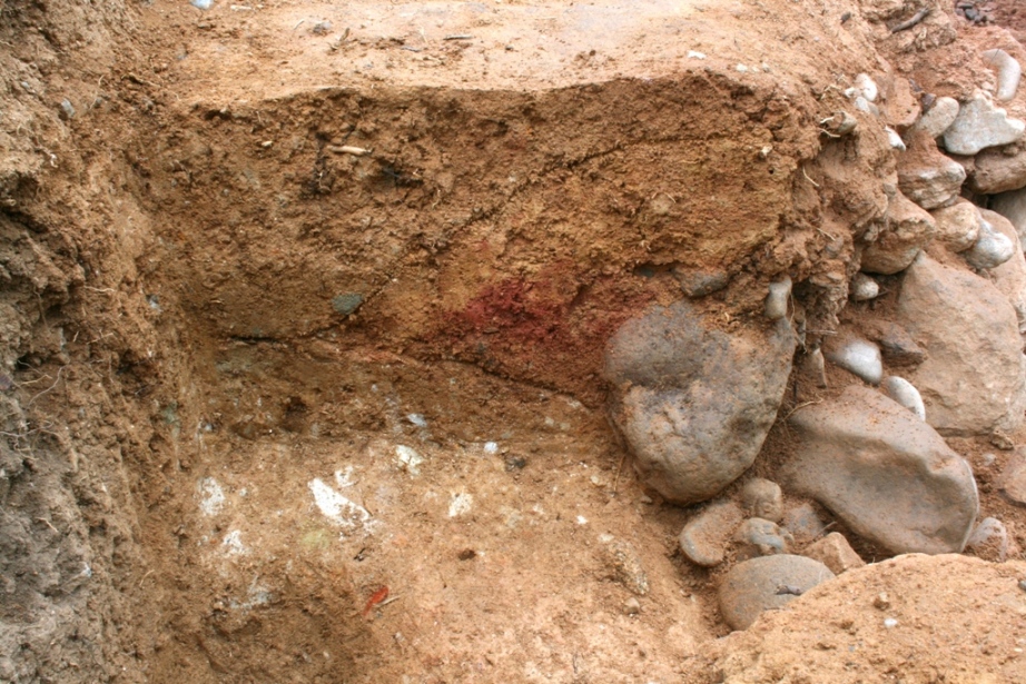 ・底面外周部では、この礫面の上に板石が載る地点がいくつかある。したがって、この礫面がひとつの作業単位であり、壁体構築までの基礎に相当するバラスで、そこで赤色顔料を塗布したと推定される。
