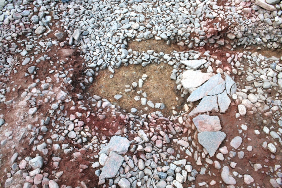 ・そこに四角く墓坑を掘り込み(おそらく排水溝も)、基礎のグリ石を入れる。