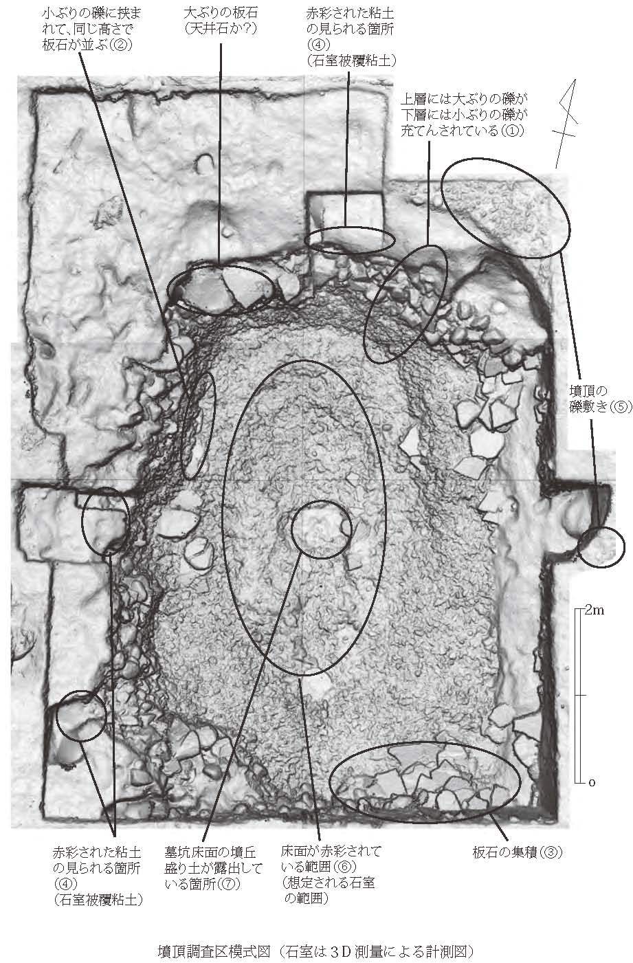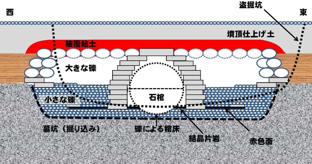 ・この粘土は構築墓坑と同時に築成した盛土上面から貼り付け始め、その上面の高さよりも盛り上げるようにしており、「被覆粘土」とよぶにふさわしい。この埋葬施設では、天井部分からやや広い範囲に被覆粘土を貼り付けるのではなく、墓坑相当の礫の範囲全体を覆っており、きわめて特徴的といえる。