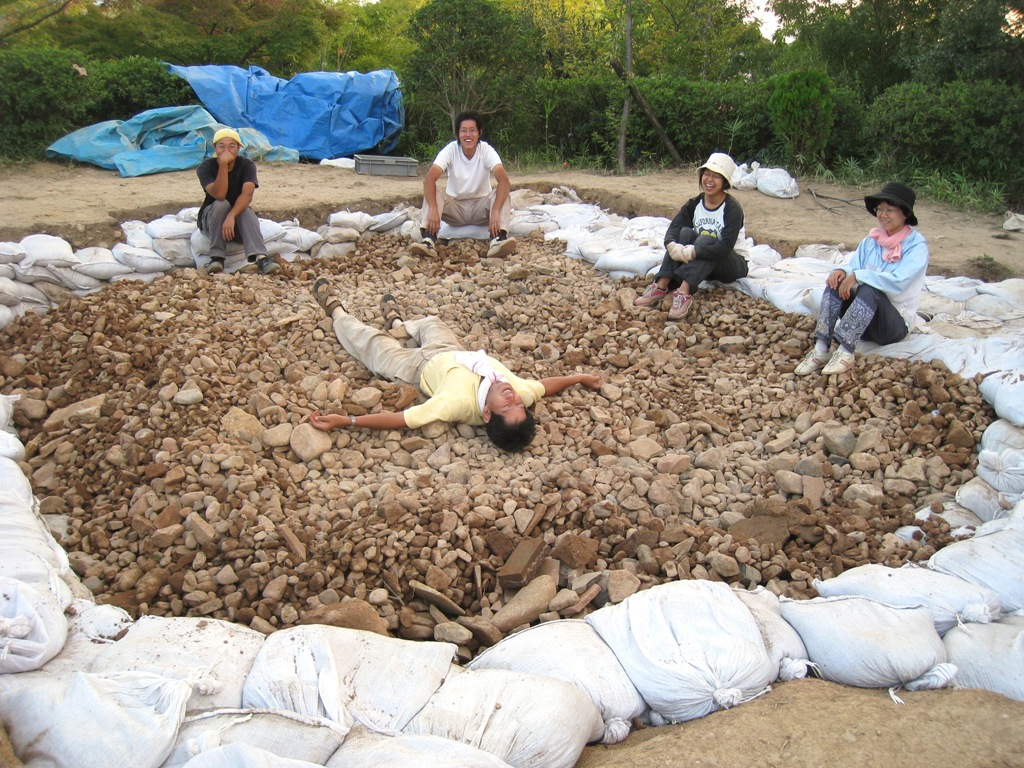 ・12:45(?)には再開、土嚢を調査区周囲まで運ぶ(1時間かかってしまう)。それを開いて埋め戻し。